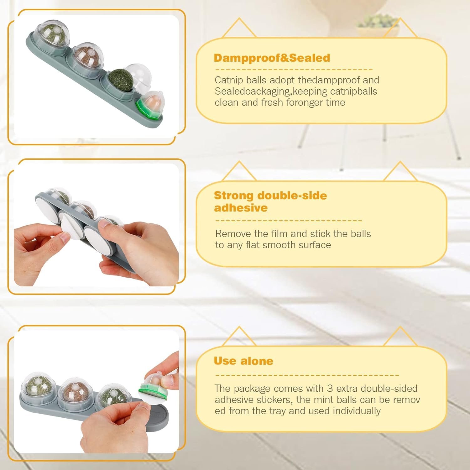 - 【Unique Design of Catnip Toy】 The cat toy can easily stick to the wall or other surfaces with strong viscous force, with no falling off when your kitten licks and plays. You can give him cat stuff and let him choose his favorite flavor. The catnip treat balls can be rotated 360 degrees when licking