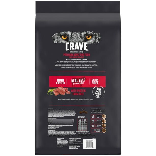 About this itemProduct detailsDogs want the taste and nutrition of a diet that’s rich in animal proteins-not soy or grains such as corn or wheat. And the reason is simple. Protein-rich diets provide the nutrients for a lean, healthy body and the energy to chase. Like the diets of their wolf ancestors, CRAVE™ recipes are always crafted with real, high-quality animal protein, the full meaty flavor dogs love and no grains. Contains one (1) 22 lb. bag of CRAVE High Protein Adult Grain Free With Protein from Beef Natural Dry Dog Food Plus Vitamins, Minerals, and Other Nutrients CRAVE™ recipes are always crafted with real, high-quality animal protein, the full meaty flavor dogs love and no grains. High protein: Made with 34% protein, to support a strong, lean body Grain free with carbohydrate sources like peas for energy Quality ingredients: NO chicken by-product meal, NO corn, wheat, or soy protein, NO artificial flavors, colors, or preservatives Protein-rich recipe complete with the quality nutrients your dog needs Feed your breed: Ideal as both large and small breed dog food, CRAVE’s healthy dog food formula is perfect for your dog’s dietary needs, no matter their size Real meat is our first ingredient. Wolves and modern dogs thrive on a diet of high quality animal protein error:We aim to show you accurate product information. Manufacturers, suppliers and others provide what you see here, and we have not verified it. See our disclaimer