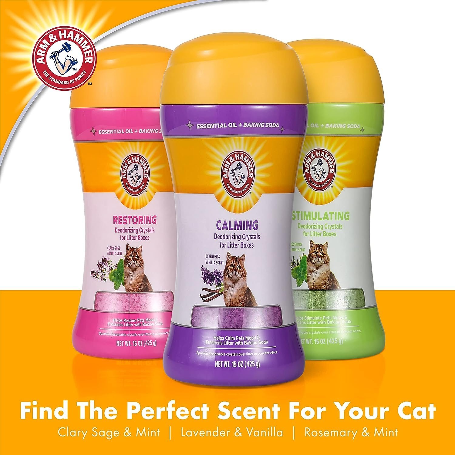 • Baking soda: The signature Baking Soda ingredient plus essential oils helps deodorize cat odors in the home to leave behind total freshness