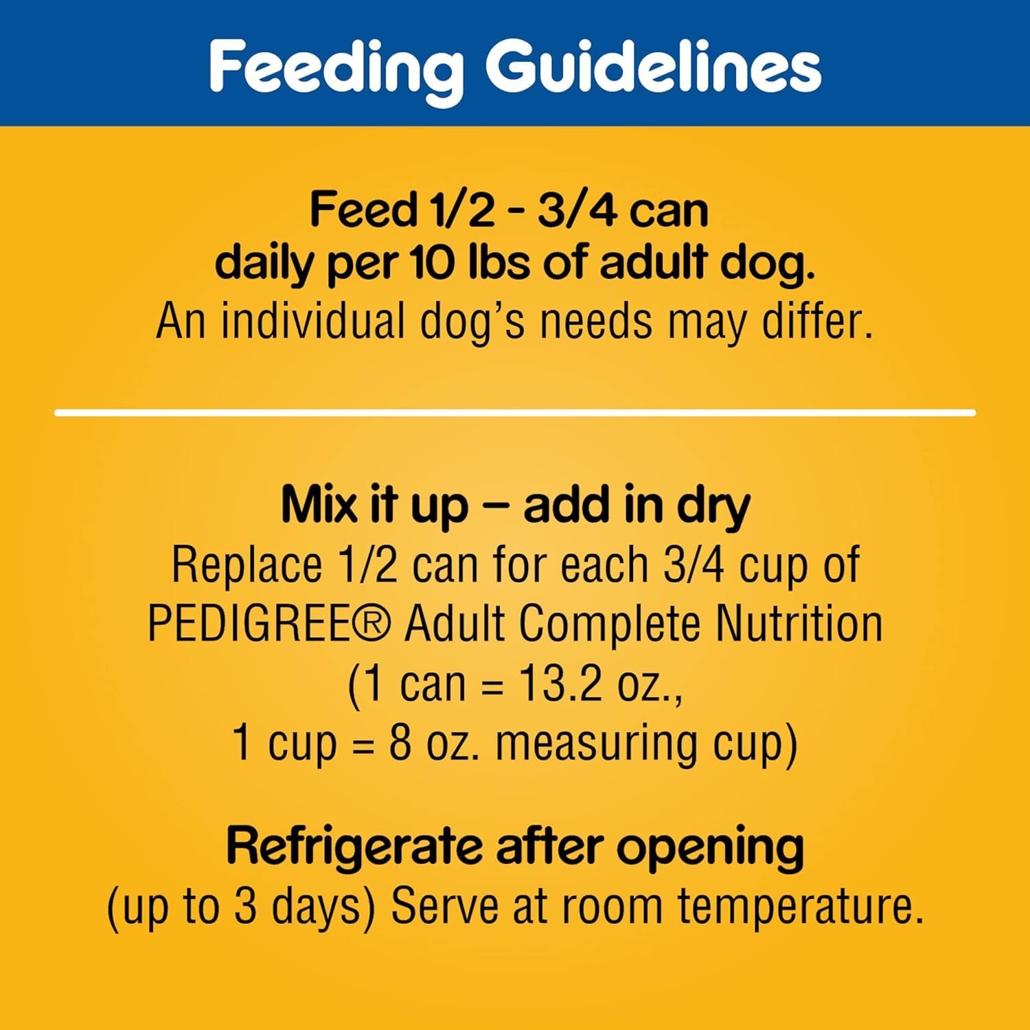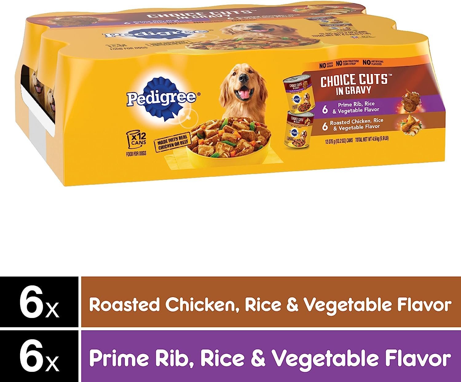 PEDIGREE CHOICE CUTS IN GRAVY prime rib, rice & vegetable flavored and roasted chicken, rice & vegetable flavored soft, wet dog food gives your dog the taste they crave with the nutrition they need. Your adult dog can enjoy the delicious taste of real chicken or beef and delectable gravy sauce in every bite with our hearty wet dog food. PEDIGREE formulas provide the perfect balance of vitamins and minerals with no artificial flavor, no added sugar, and no high fructose corn syrup. Each recipe is balanced for adult dogs, so you know they are getting the most from their wet dog food. You can serve this dog food as a topper, mixer or on its own. Any way you serve it up, PEDIGREE canned dog food can help your dog grow happy and healthy.